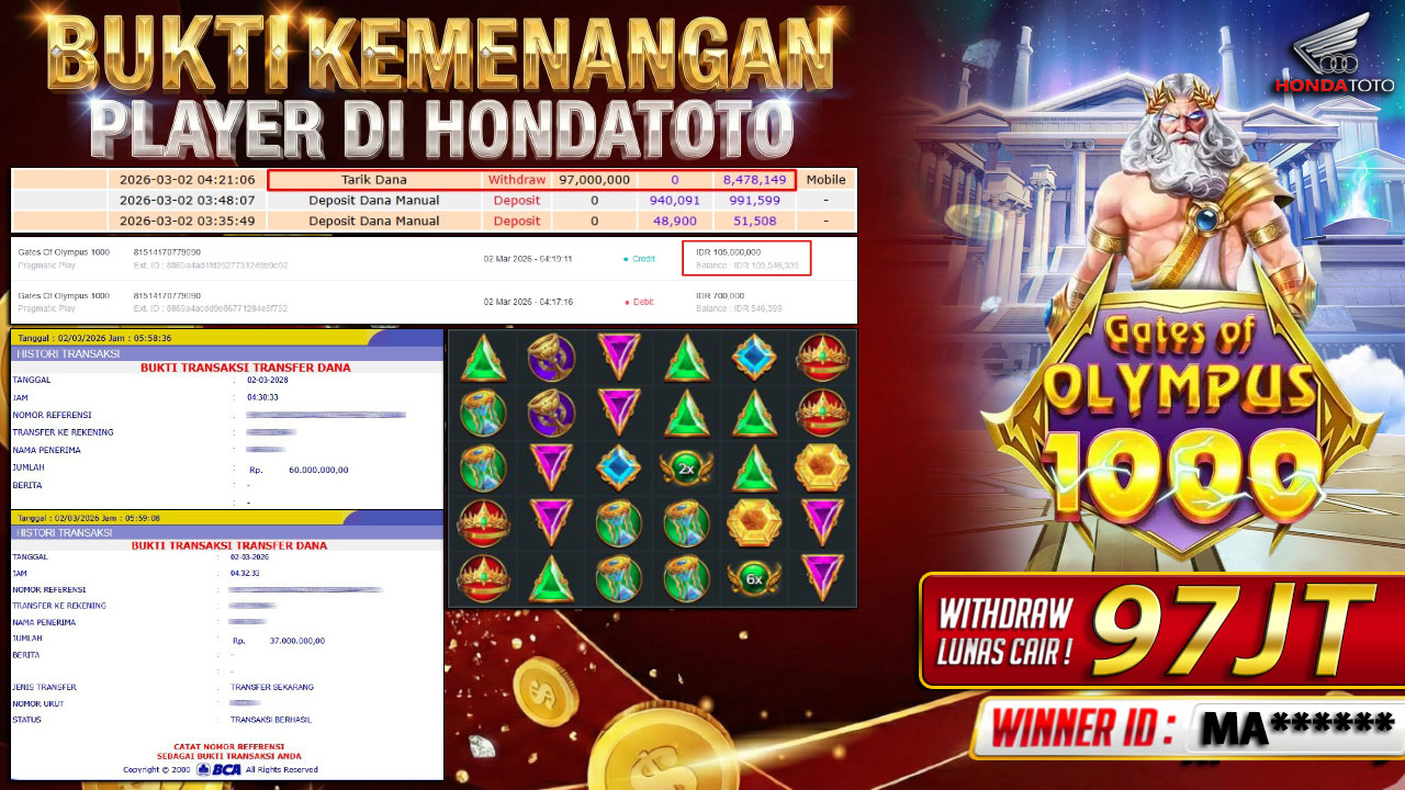 Bandar togel HONDATOTO merupakan bandar togel dan slot online yang membayar semua kemenangan member hingga lunas. Setiap pembayaran pada situs kami dilakukan dengan cara transfer ke rekening tujuan yang sudah di daftarkan pada situs togel online kami, Pembayaran hanya dapat di proses jika rekening yang di daftarkan telah valid dan dapat di transfer. Semua kemenangan member yang mendapatkan hadiah jackpot terbesar akan kami posting agar semua pemain dapat melihat bandar situs terpercaya HONDATOTO ini membayar semua kemenangan member hingga lunas. Setiap postingan yang kami posting akan kami lakukan sensor pada nomor rekening 4 digit dan nama rekening untuk menjaga privasi dan kerahasiaan member. Postingan Jackpot yang kami posting agar member atau pemain yang belum pernah bermain bisa melihat bandar togel Bukan Kaleng Kaleng Seperti HONDATOTO ini, Semua postingan jackpot yang kami posting dapat di lihat data keasliannya melalui nomor reff yang di tunjukan pada bank atau mbanking saat kita melakukan transfer.